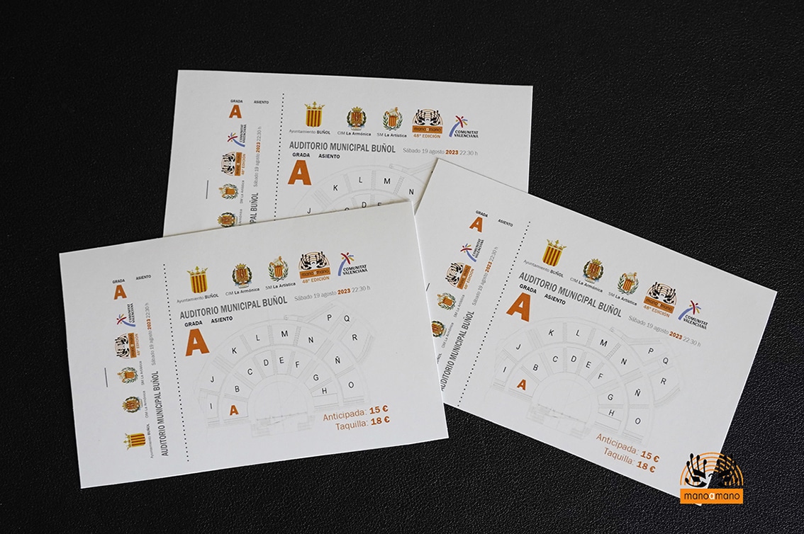 Las entradas anticipadas han salido a la venta con un precio de 15 euros, 3 menos de lo que costarán en taquilla; y podrán adquirirse, o bien contactando con ambas sociedades musicales, o bien físicamente en Buñol durante varios días en un horario preestablecido.