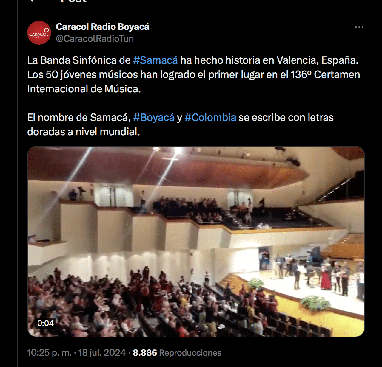 La emisora de radio Caracol de Samacà se hizo eco del triunfo de la agrupación colombiana y calificó como histórica su victoria en el 136 edición del Certamen Internacional de Bandas de Música Ciudd de València: así lo postró en un twit